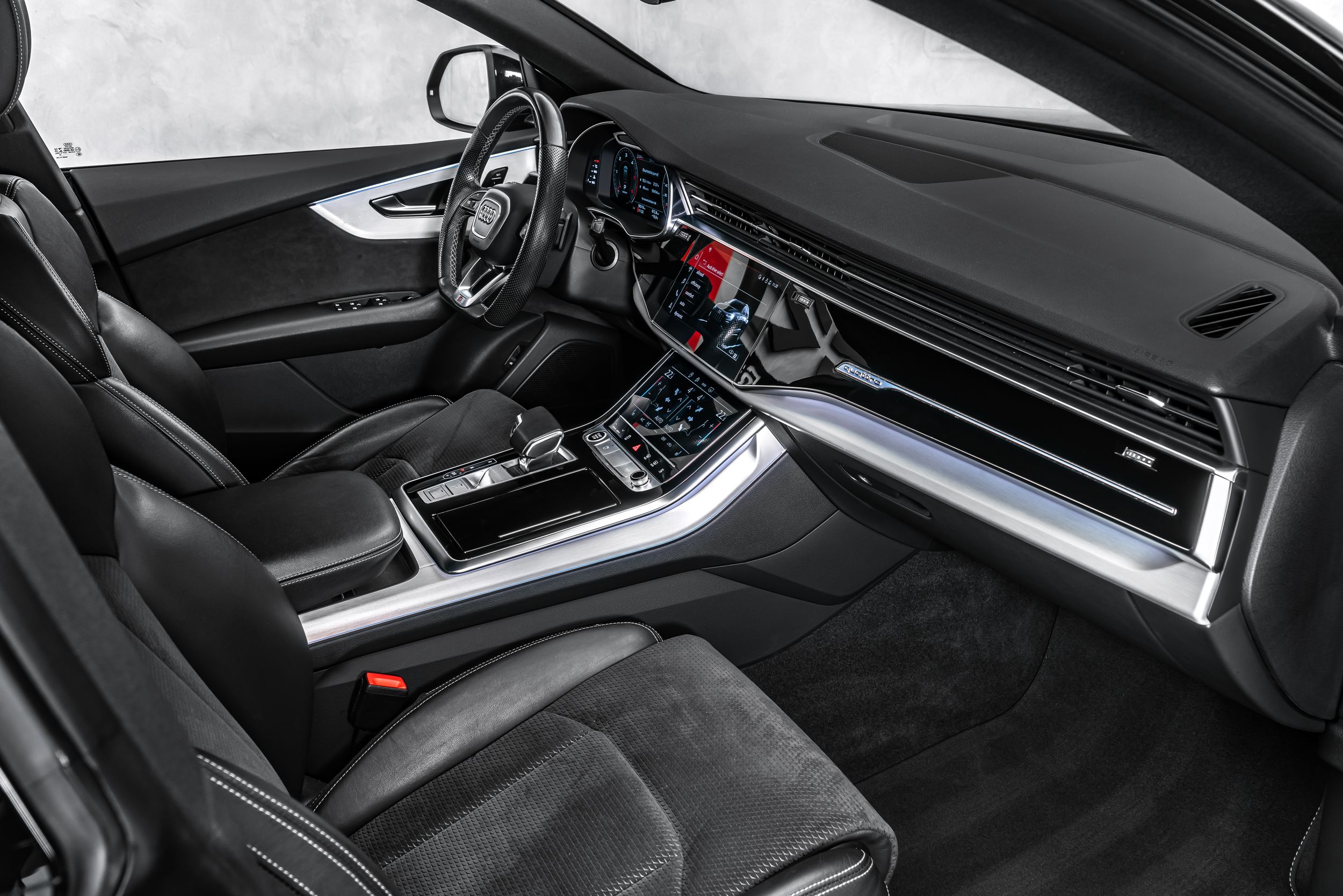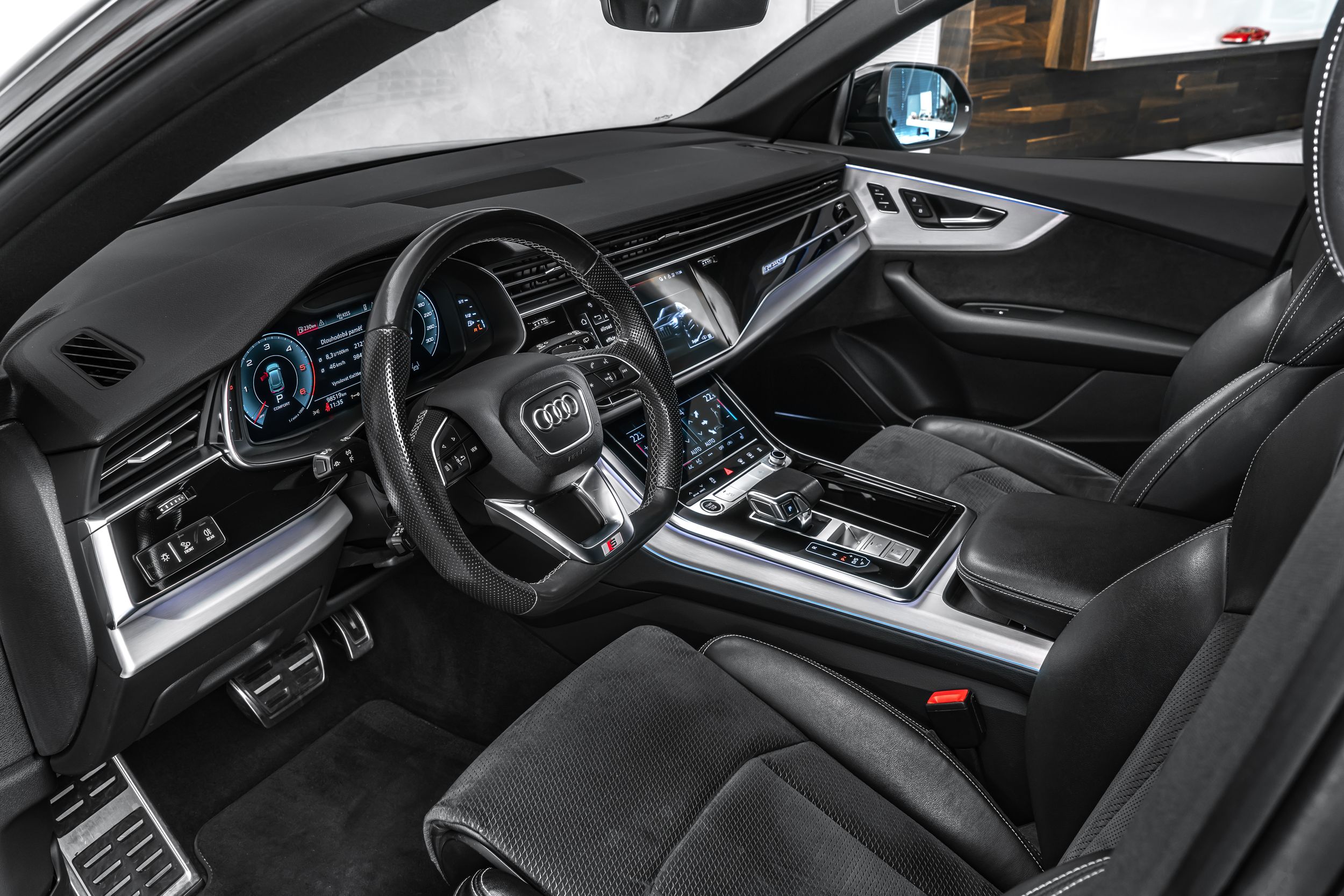 Řízení všech kol, paket asistenčních služeb Tour, rozhraní Audi music v zadní části vozu, paket výbavy S line Sport / Plus, elektricky nastavitelná vnější zrcátka. Nastavitelná, vyhřívaná a sklopná vnější zrcátka s automatickým stmíváním a paměťovou funkcí, červeně lakované brzdové třmeny, černé střešní nosiče, zamykání kol, světlomety HD Matrix LED, úchyty Isofix pro dětské sedačky na sedadle spolujezdce, 4zónová automatická klimatizace, digitální přístrojový panel (virtuální kokpit plus), komfortní klíč se senzorem ovládaným otevíráním víka zavazadlového prostoru (otevírání + zavírání), paket konturového/ambientního osvětlení (plus), sportovní kožený volant (3ramenný, zploštělý dole) s multifunkčními a řadicími pákami, kola z lehkých slitin 10x22 (5paprsková, hvězdicový design, antracitově černá lesklá úprava, diamantově soustružená), černý paket Styling, couvací kamera, dělené/skládací a posuvné opěradlo zadních sedadel (40:20:40), elektricky dovírané dveře, čalounění sedadel: Alcantara Frequency/kůže, elektricky nastavitelná přední sedadla. Nastavitelné (s pamětí), audiosystém Bang & Olufsen, nezávislé topení, design nárazníku: základní (plně lakovaný), tónovaná zadní okna (zatmavená skla).