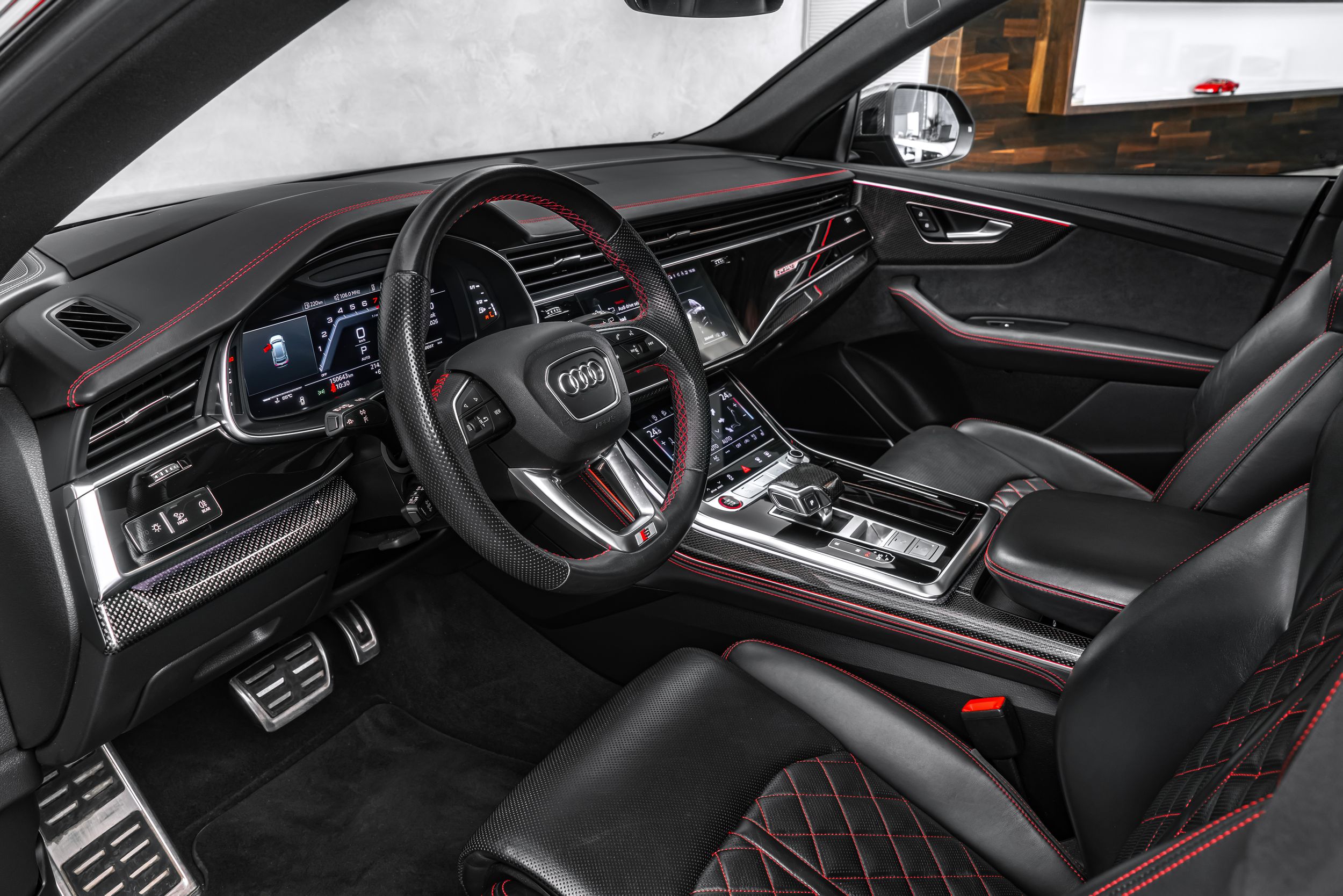 Asistenční balíček Parkování s asistentem dálkového parkování, asistenční balíček Tour, loga a nápisy Audi v lesklé černé barvě, rozhraní Audi Smartphone Interface, elektricky nastavitelné, vyhřívané a sklopitelné vnější zrcátka s automatickým stmíváním a pamětí, handsfree systém Bluetooth s rozpoznáváním hlasu (Audi Phone Box), brzdové třmeny lakované červeně, balíček Carbon Style, střešní ližiny černé, zabezpečení kol proti krádeži (zámky ráfků), LED osvětlení nástupních prostorů s projekční funkcí, asistenční systém: asistent změny jízdního pruhu (Side Assist) včetně Audi pre sense rear, HD Matrix LED světlomety, head-up displej, vnitřní výbava: dekorativní vložky z karbonu, vnitřní výbava: rozšířené prvky interiéru v kůži, vnitřní výbava: červené prošívání, komfortní klíč s bezdotykovým odemykáním zadních dveří a alarmem proti krádeži včetně (otevření + zavření), balíček konturového / ambientního osvětlení (plus), lehká kola 10x23 (10paprskový trapézový design, černá, Audi Sport), metalický lak, optický balíček černý plus, panoramatická střecha vpředu elektrická, vzadu pevná, opěradlo zadních sedadel dělené/sklopné, posuvné (40:20:40), sportovní sedadla plus vpředu, boční airbagy vzadu, servo zavírání dveří, ventilace sedadel a masážní funkce vpředu, potah sedadel / čalounění: kůže Valcona s kosočtvercovým prošíváním, přední sedadla elektricky nastavitelná (vlevo s pamětí), zvukový systém Bang & Olufsen, USB nabíjecí porty (2 ks, typ C) pro cestující na zadních sedadlech, zadní skla tónovaná (Privacy skla);