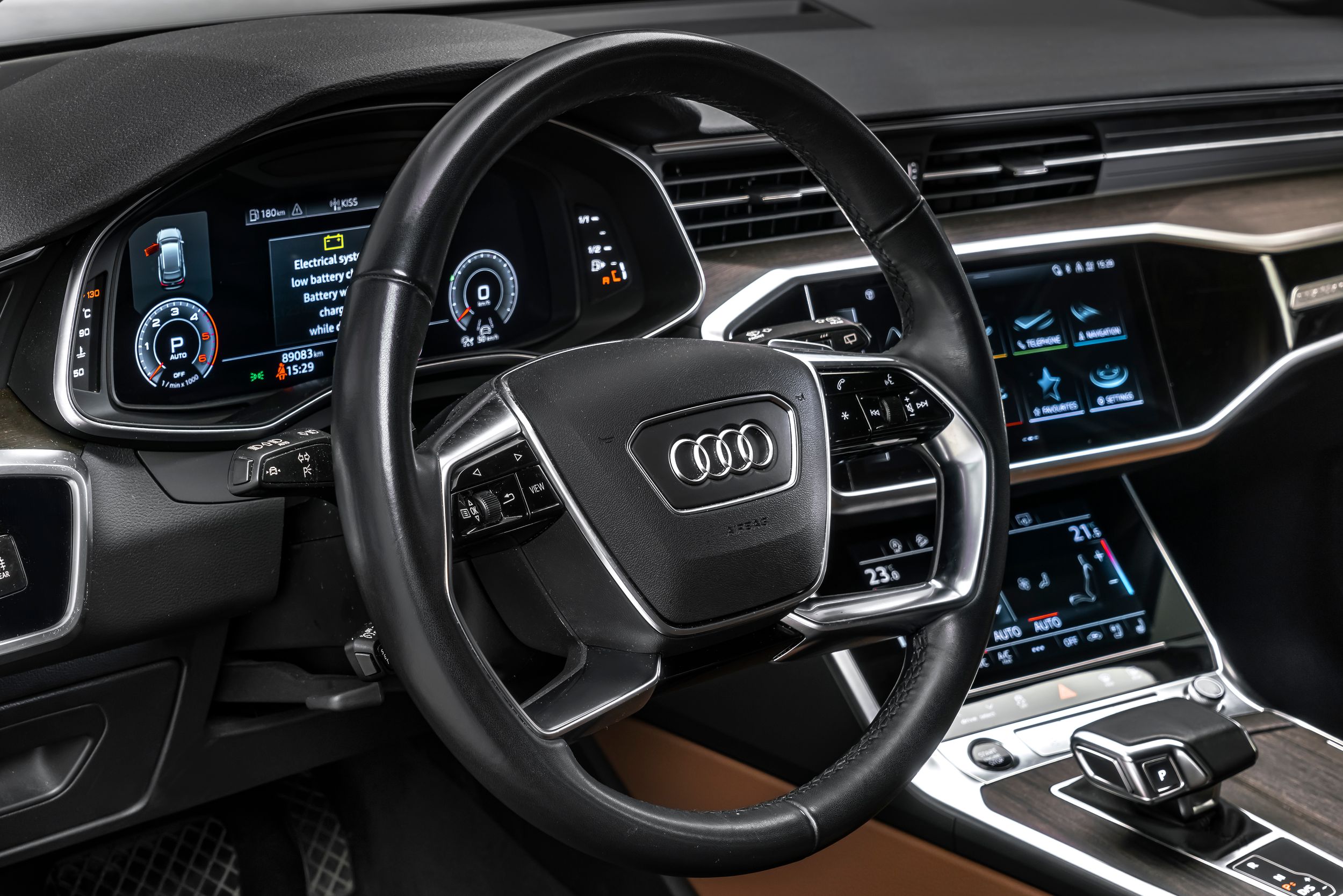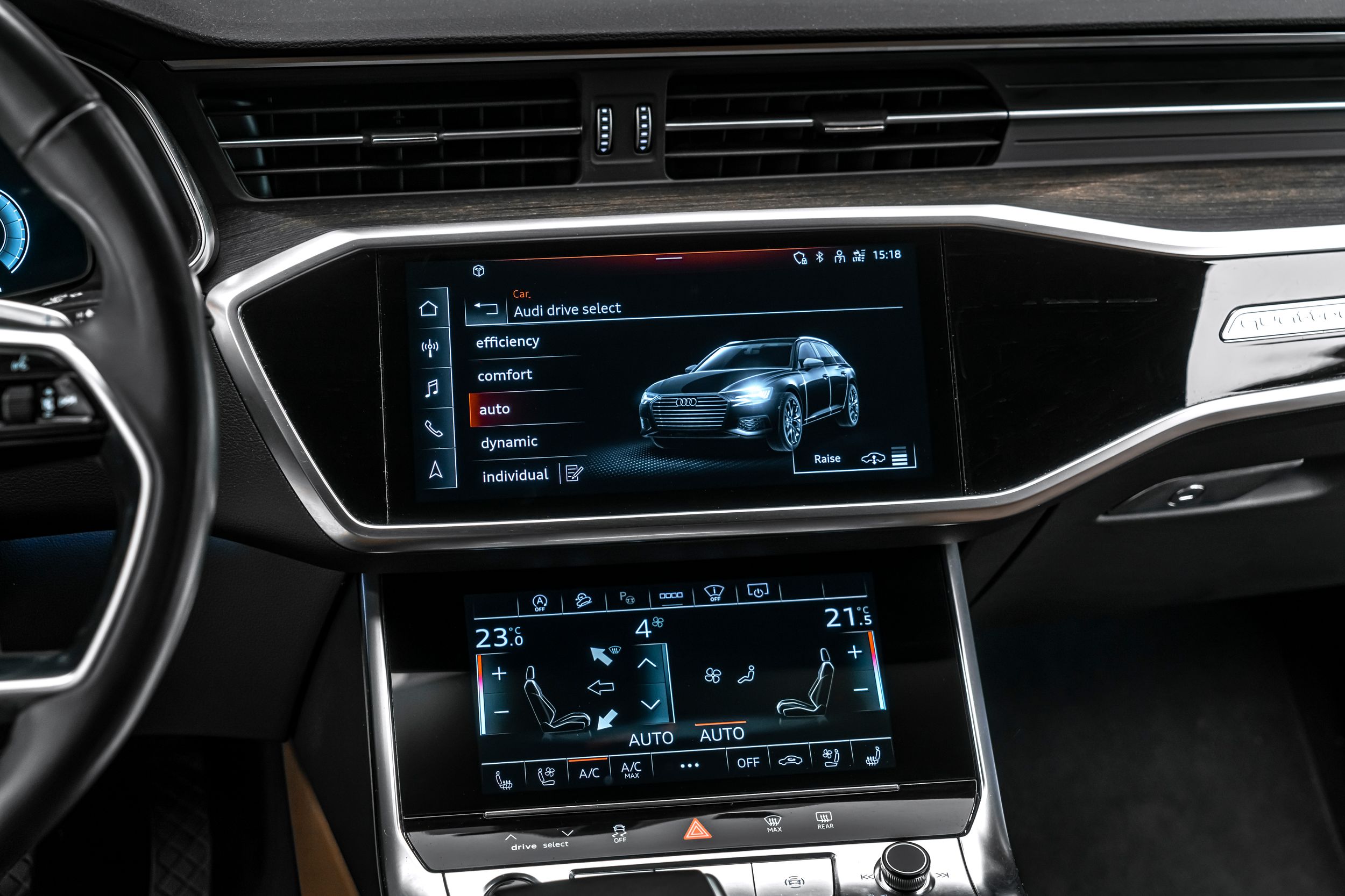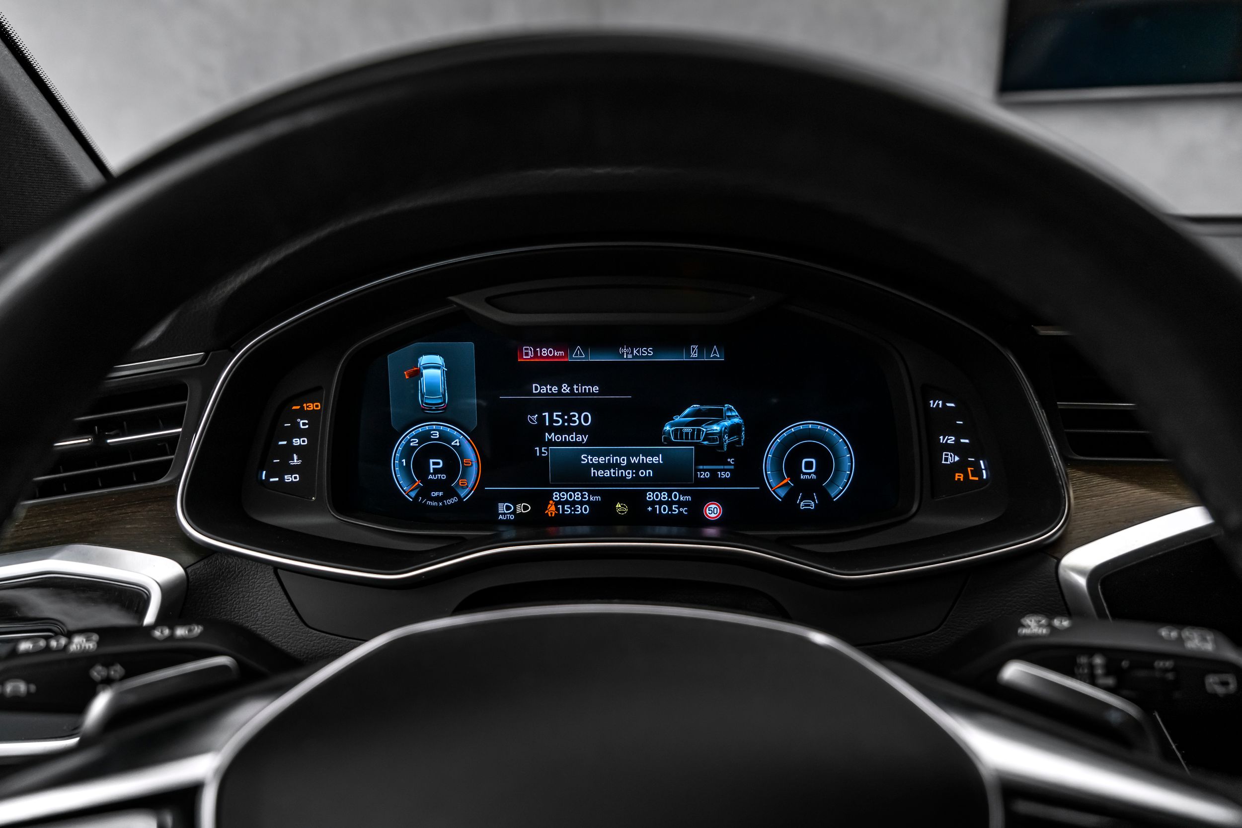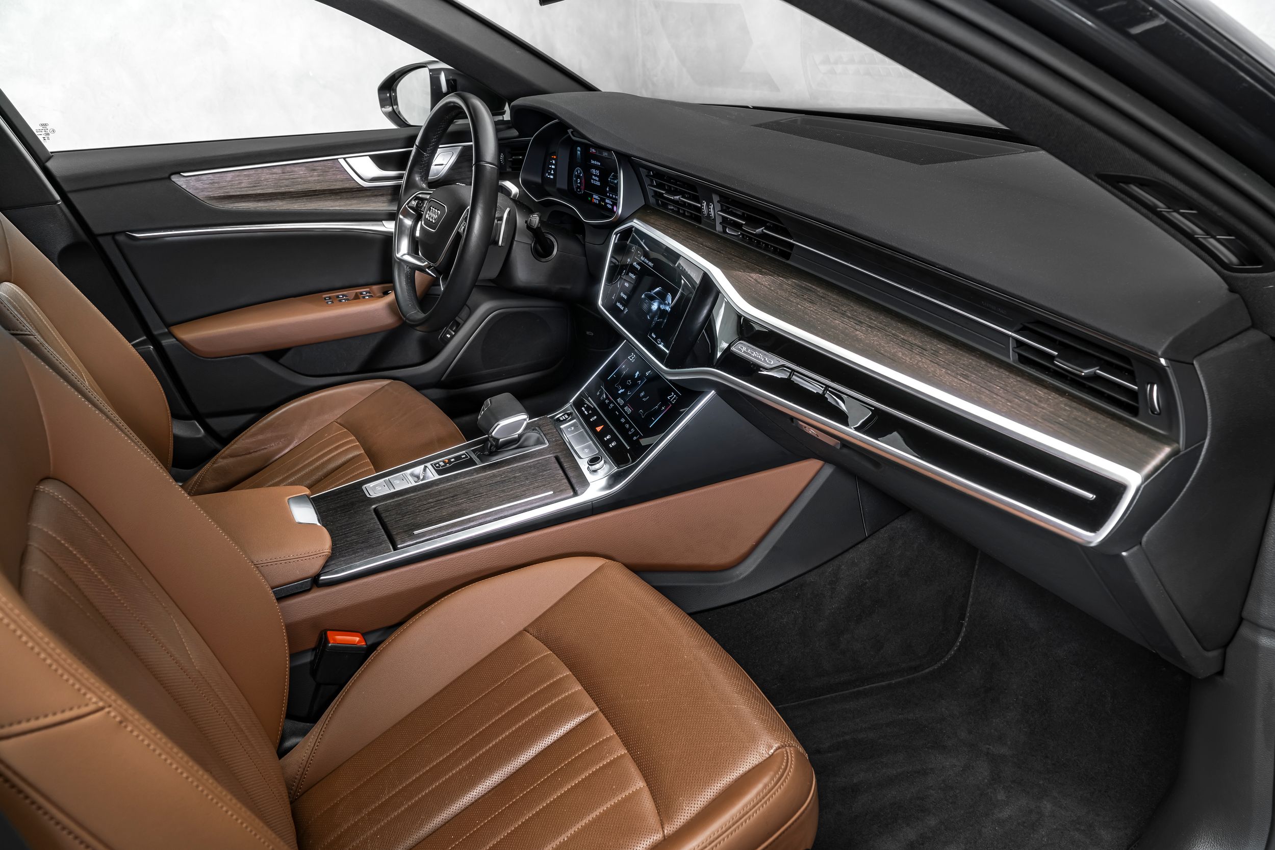 Ambientní osvětlení, paket asistenčních služeb Tour, elektricky nastavitelná vnější zrcátka. Nastavitelná, vyhřívaná a sklopná vnější zrcátka s pamětí; ovládací prvky s imitací skla včetně prodloužených hliníkových obložení; handsfree systém Bluetooth s hlasovým rozpoznáváním (Audi Phone Box); černý látkový čalounění stropu; zamykání kol; asistent změny jízdního pruhu (Side Assist) včetně Audi pre sense rear; vyhřívané akustické čelní sklo; 24litrová nádrž na močovinu (SCR); head-up displej; automaticky stmívatelné zpětné zrcátko; úchyty ISOFIX pro dětské sedačky na sedadle spolujezdce; 4zónová automatická klimatizace; komfortní klíč se senzorem ovládaným otevíráním víka zavazadlového prostoru (otevírání + zavírání); 73litrová palivová nádrž; 8,5x19palcová kola z lehkých slitin (10 paprsků, dynamický design); Matrix LED světlomety; metalický lak; multimediální rozhraní MMI Navigation Plus s MMI Touch; sklopné rezervní kolo. Couvací kamera, odvětrávání předních sedadel, potah/čalounění sedadel: kombinace kůže/mono.pur 550, elektricky nastavitelná přední sedadla (levá s pamětí).