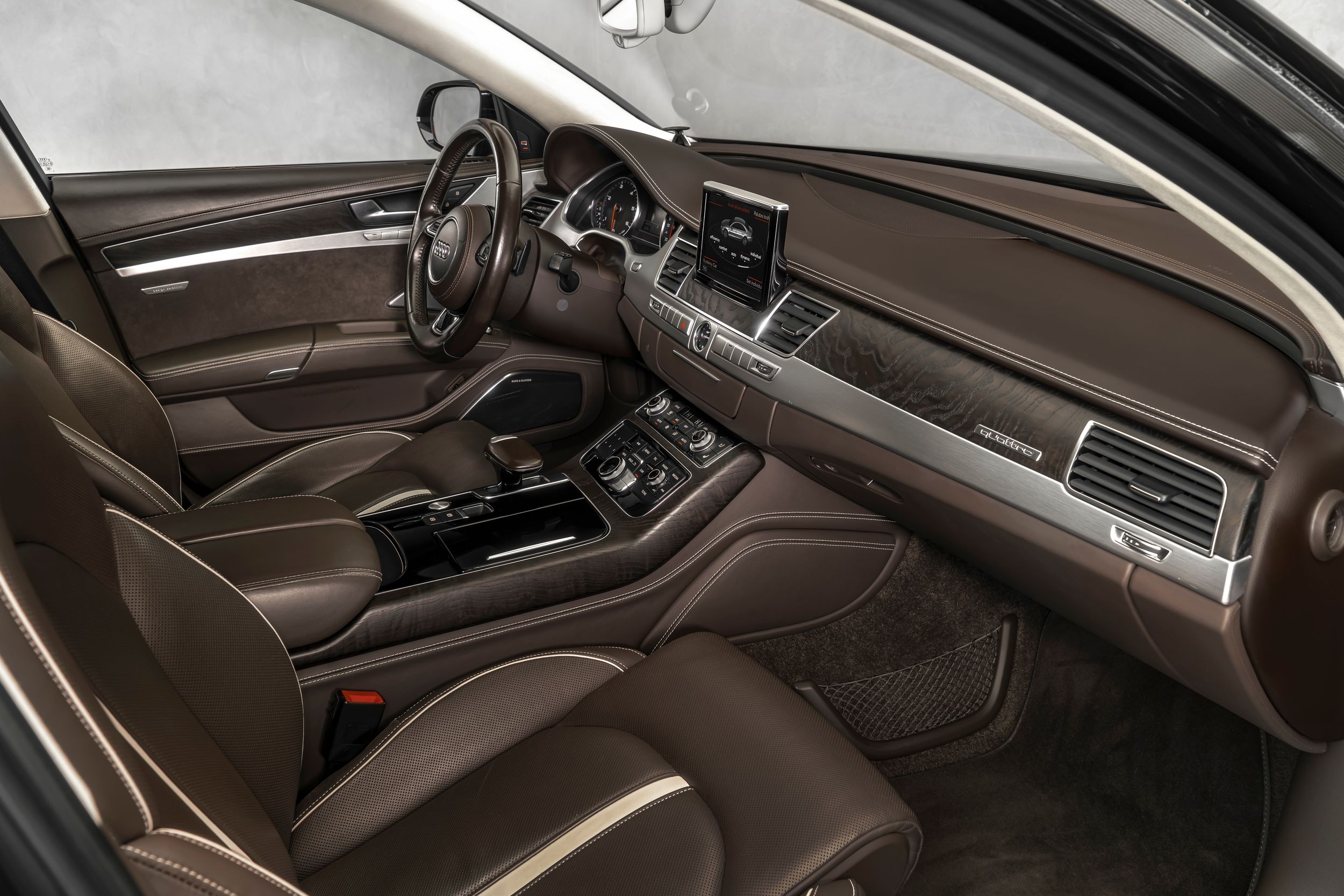 Asistenční balíček včetně Audi pre sense plus, výbavový balíček: Audi Design Selection, barva balaobraun, asistenční systém: noční vidění, balíček zavazadlového prostoru, kamerový systém s přehledem okolí (Top View), komfortní klíč se senzorovým ovládáním odemykání zadních dveří včetně (otevírání + zavírání), hliníkové disky 9x21 (5 ramen, Rotor, titanový vzhled), Matrix LED světlomety, elektrické střešní okno se solárními články a automatickým předvolením, servozavírání dveří, zvukový systém Bang & Olufsen Advanced, sportovní podvozek (adaptivní vzduchové odpružení – sport), nezávislé topení s časovým spínačem, zásuvka 230 V, tepelně izolační skla s vyhříváním čelního skla, vzadu tónovaná (izolační skla);