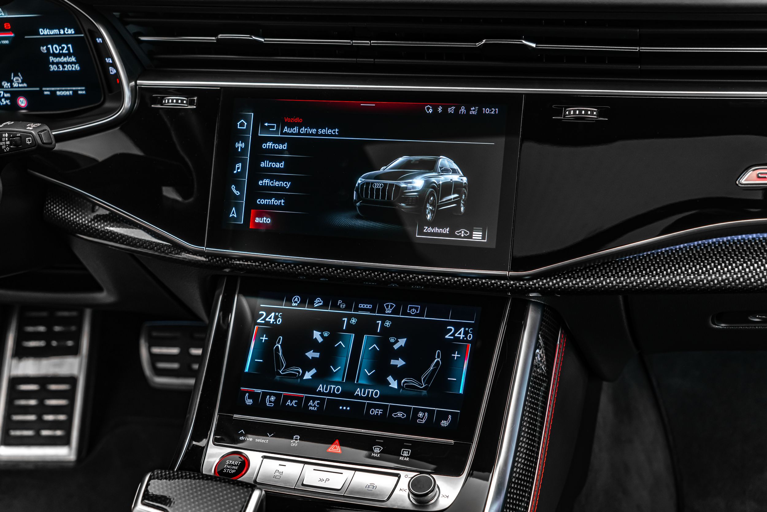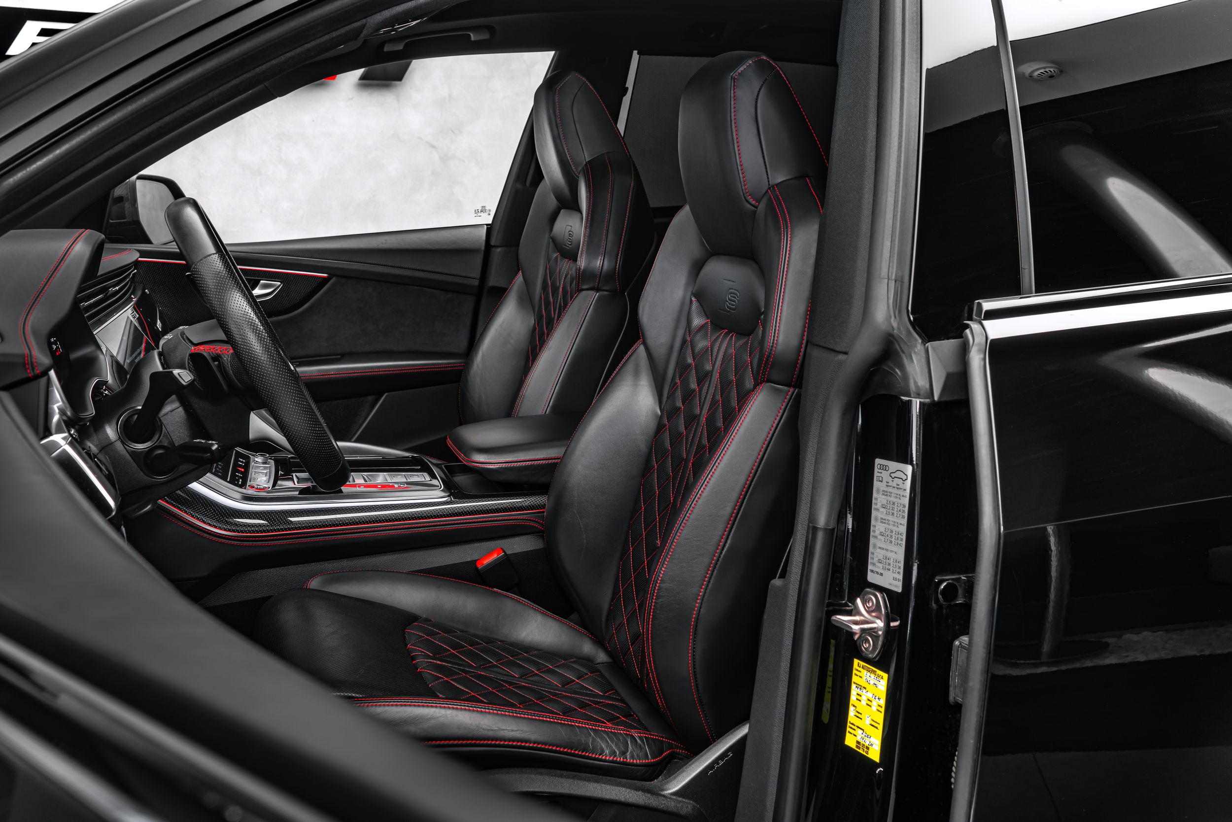 Asistenční balíček Parkování s asistentem dálkového parkování, asistenční balíček Tour, loga a nápisy Audi v lesklé černé barvě, rozhraní Audi Smartphone Interface, elektricky nastavitelné, vyhřívané a sklopitelné vnější zrcátka s automatickým stmíváním a pamětí, handsfree systém Bluetooth s rozpoznáváním hlasu (Audi Phone Box), brzdové třmeny lakované červeně, balíček Carbon Style, střešní ližiny černé, zabezpečení kol proti krádeži (zámky ráfků), LED osvětlení nástupních prostorů s projekční funkcí, asistenční systém: asistent změny jízdního pruhu (Side Assist) včetně Audi pre sense rear, HD Matrix LED světlomety, head-up displej, vnitřní výbava: dekorativní vložky z karbonu, vnitřní výbava: rozšířené prvky interiéru v kůži, vnitřní výbava: červené prošívání, komfortní klíč s bezdotykovým odemykáním zadních dveří a alarmem proti krádeži včetně (otevření + zavření), balíček konturového / ambientního osvětlení (plus), lehká kola 10x23 (10paprskový trapézový design, černá, Audi Sport), metalický lak, optický balíček černý plus, panoramatická střecha vpředu elektrická, vzadu pevná, opěradlo zadních sedadel dělené/sklopné, posuvné (40:20:40), sportovní sedadla plus vpředu, boční airbagy vzadu, servo zavírání dveří, ventilace sedadel a masážní funkce vpředu, potah sedadel / čalounění: kůže Valcona s kosočtvercovým prošíváním, přední sedadla elektricky nastavitelná (vlevo s pamětí), zvukový systém Bang & Olufsen, USB nabíjecí porty (2 ks, typ C) pro cestující na zadních sedadlech, zadní skla tónovaná (Privacy skla);
