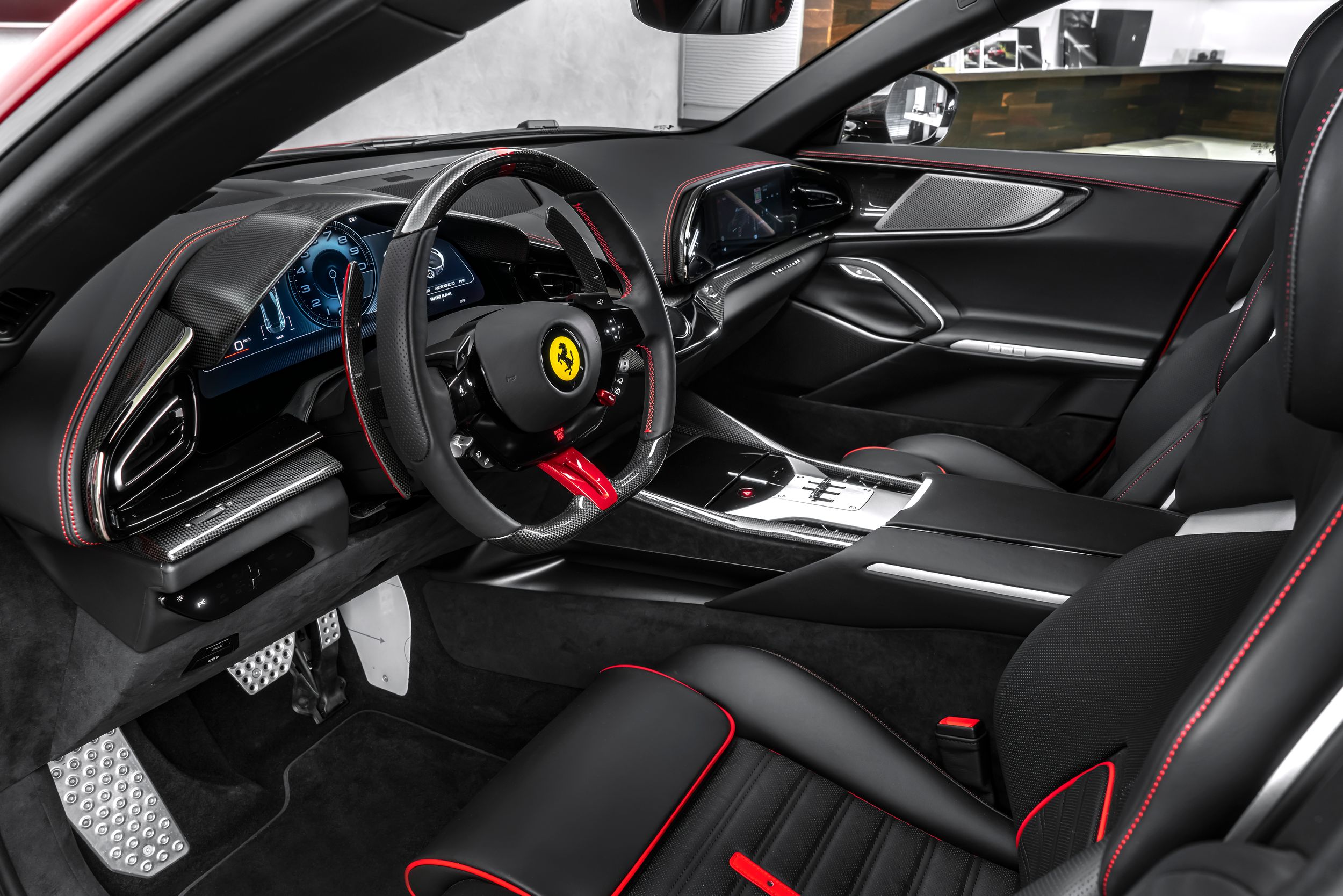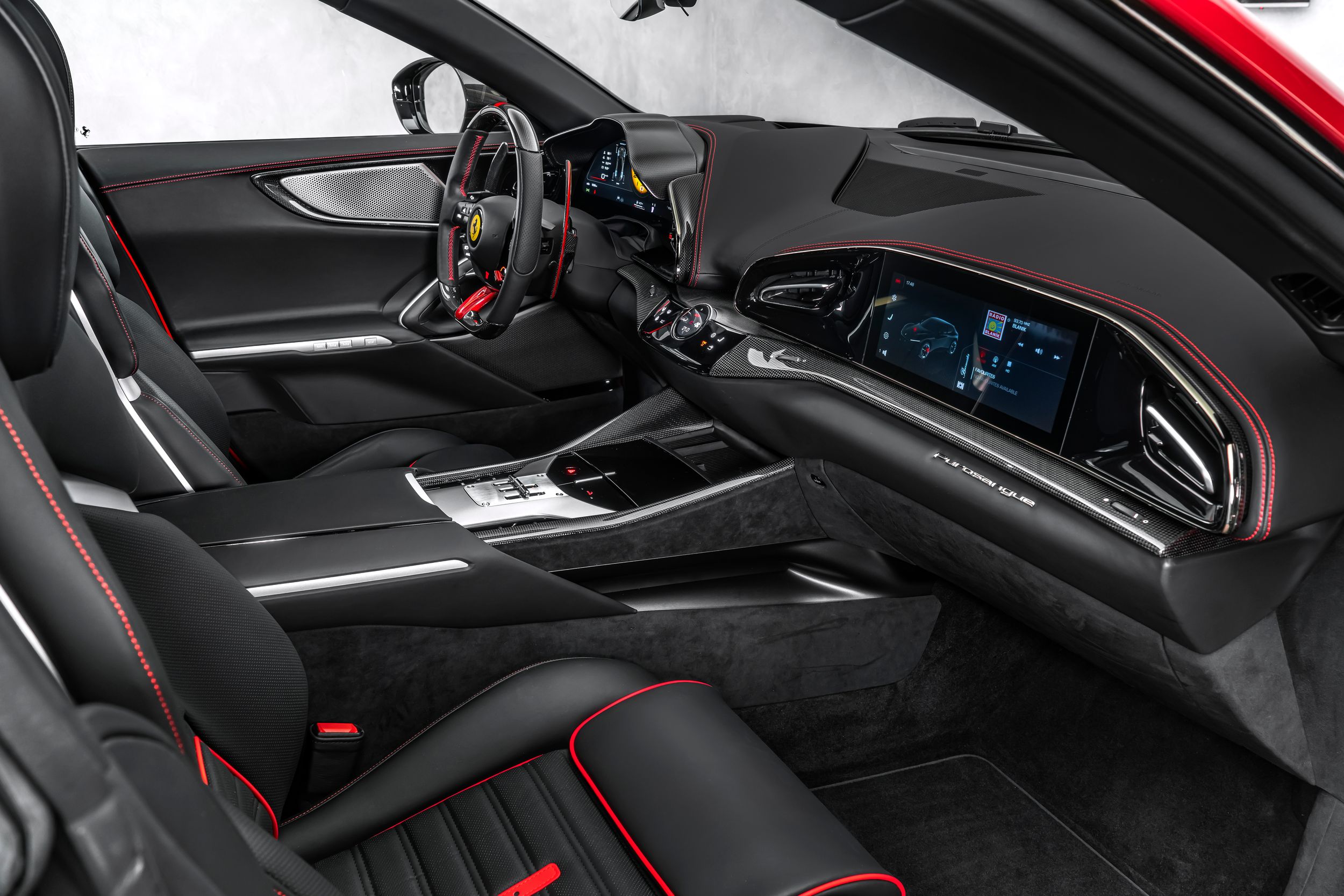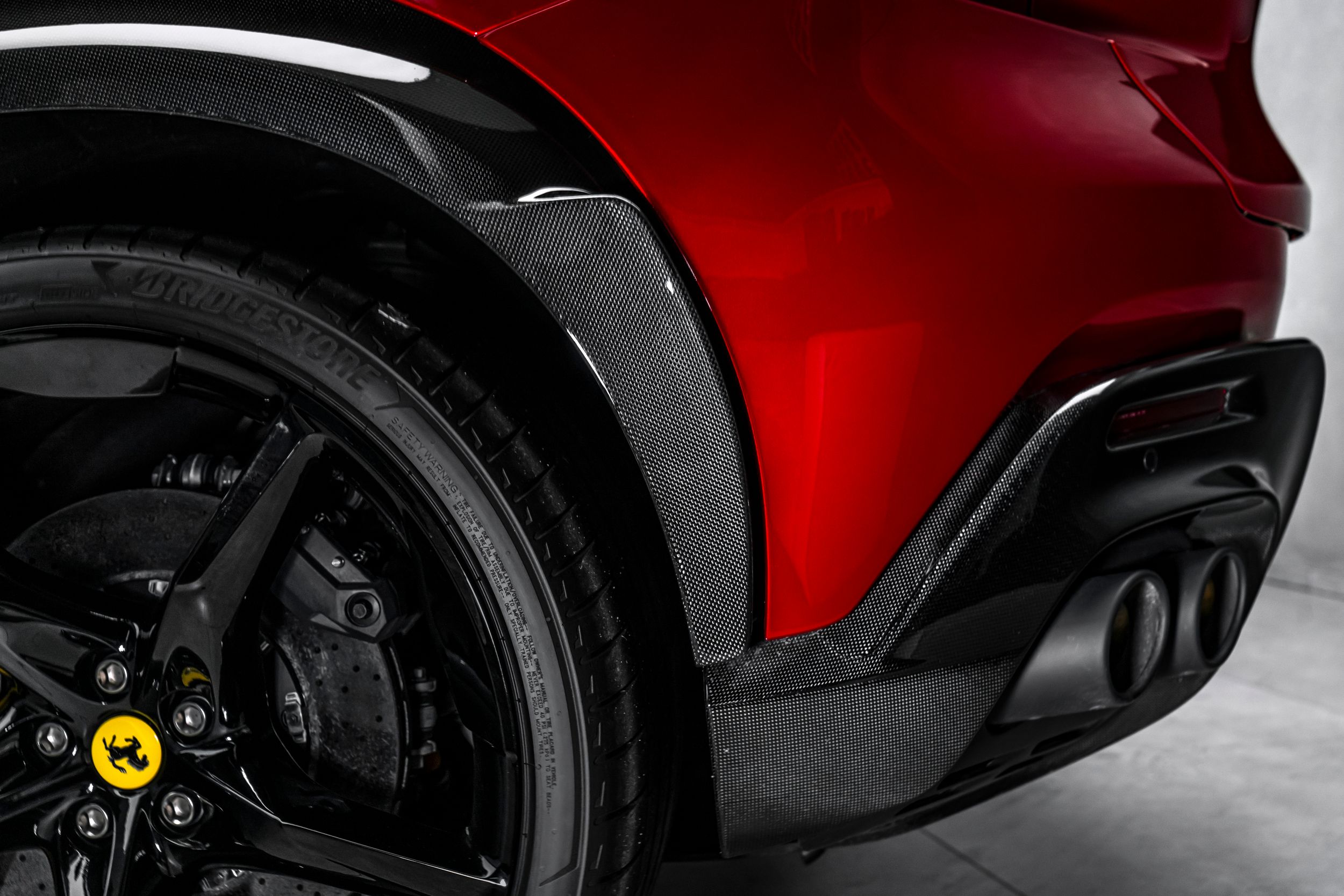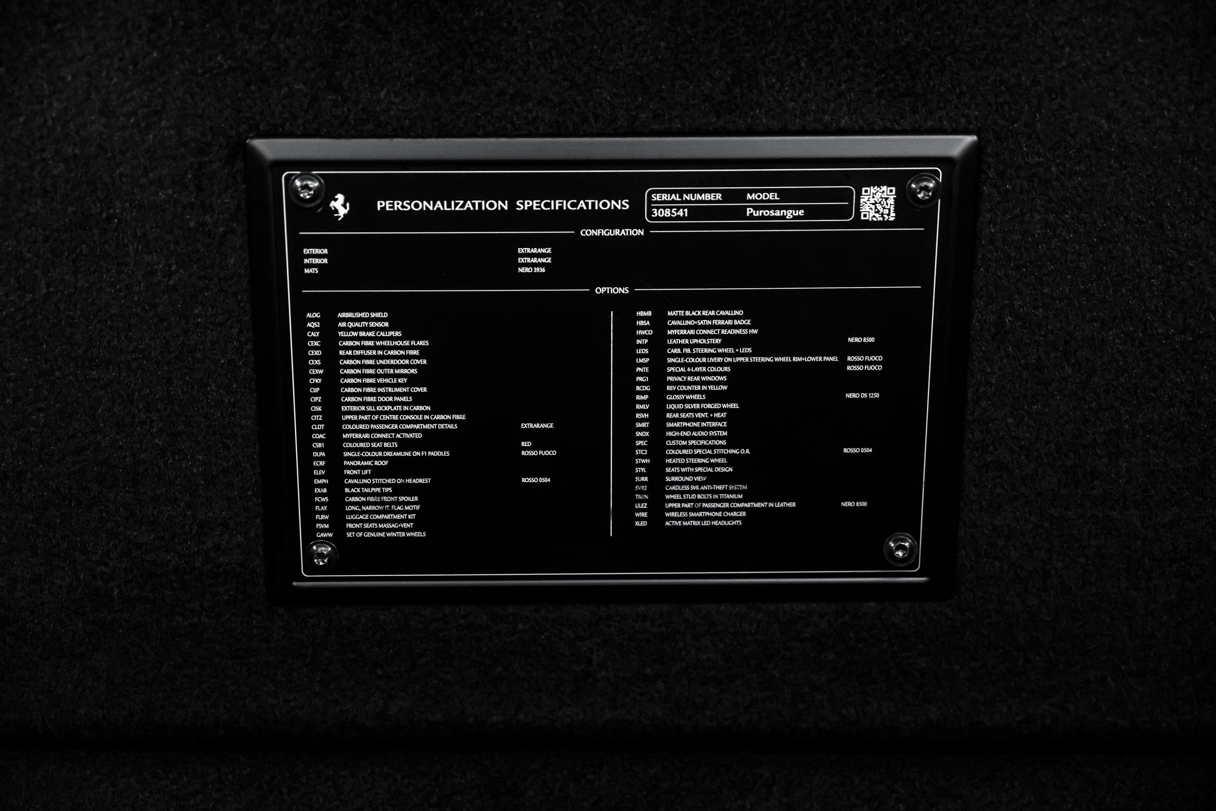 Airbrush shield, air quality sensor, yellow brake callupers, carbon fibre wheelhouse flares, rear diffuser in carbon fibre, carbon fibreouter mirrors, carbon fibre vehicle key, carbon fibre instrument cover, carbon fibre door panels, exteriour sill kickplate in carbon, upper part of centre console in carbon fibre, coloured passenger compartment details, myferrari conncet activated, coloured seat belts, single-colour dreamline on F1 Paddles, panoramic roof, front lift, cavallino stitched on headrest, black tailpipe tips, carbon fibre front spoiler, long narrow it. Flag motif, luggage compartment kit, front seats massag+vent, set of genuine winter wheels, matte black rear cavallino, cavallino+satin ferrari badge, myferrari connect readiness hw, leather upholstery, carb.fib. steering wheel + leds, single colour livery on upper steering wheel rim+lower panel, special 4-layer colours, privacy rear windows, rev counter in yellow, glossy wheels, liquid silver forged wheel, rear seats vent.+ heat, smartphone interface, high-end audio systém, custom specifications, coloured special stitching O.R., heated steering wheel, seats with special design, surround view, cardless svr anti-theft systém, wheel stud bolts in titanium, upper part of passenger compartment in leather, wireless smartphone charger, active matrix led headlights