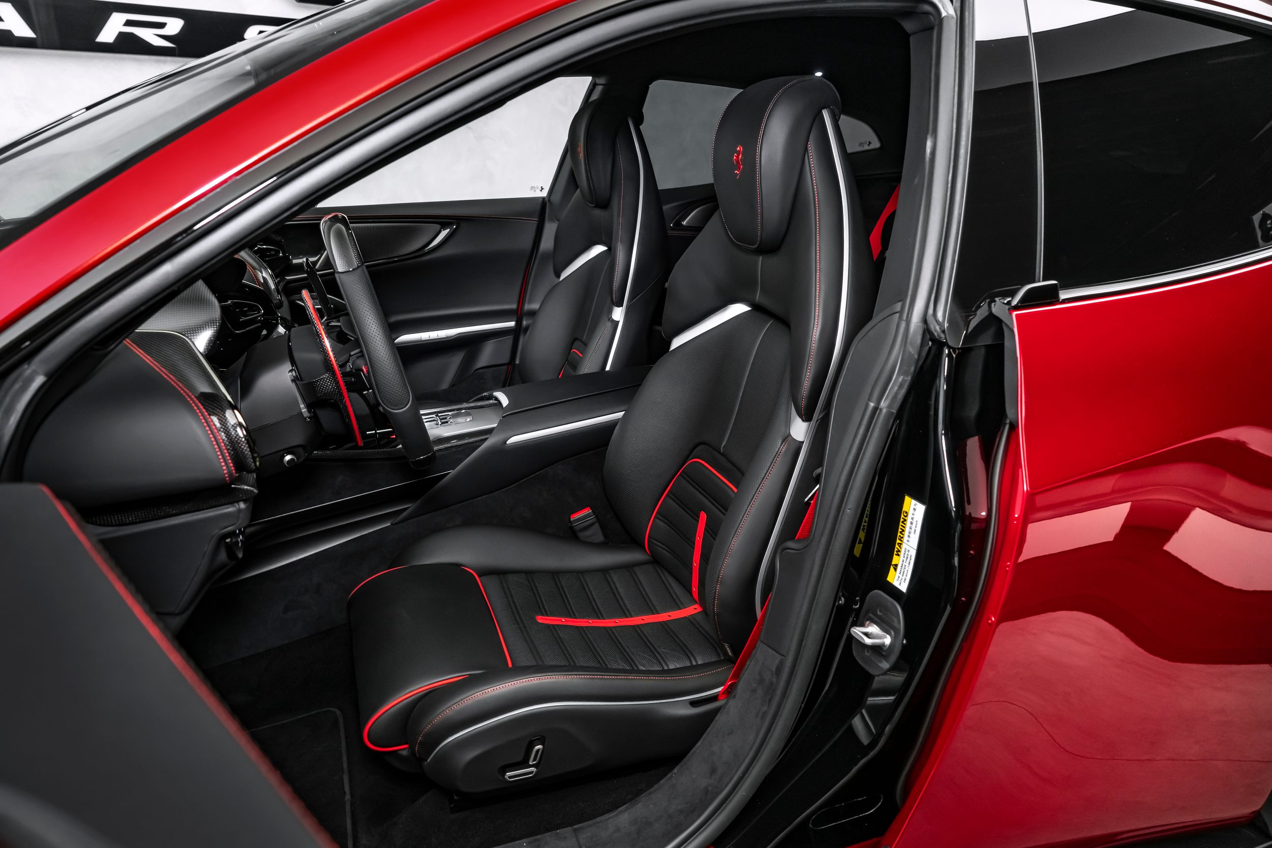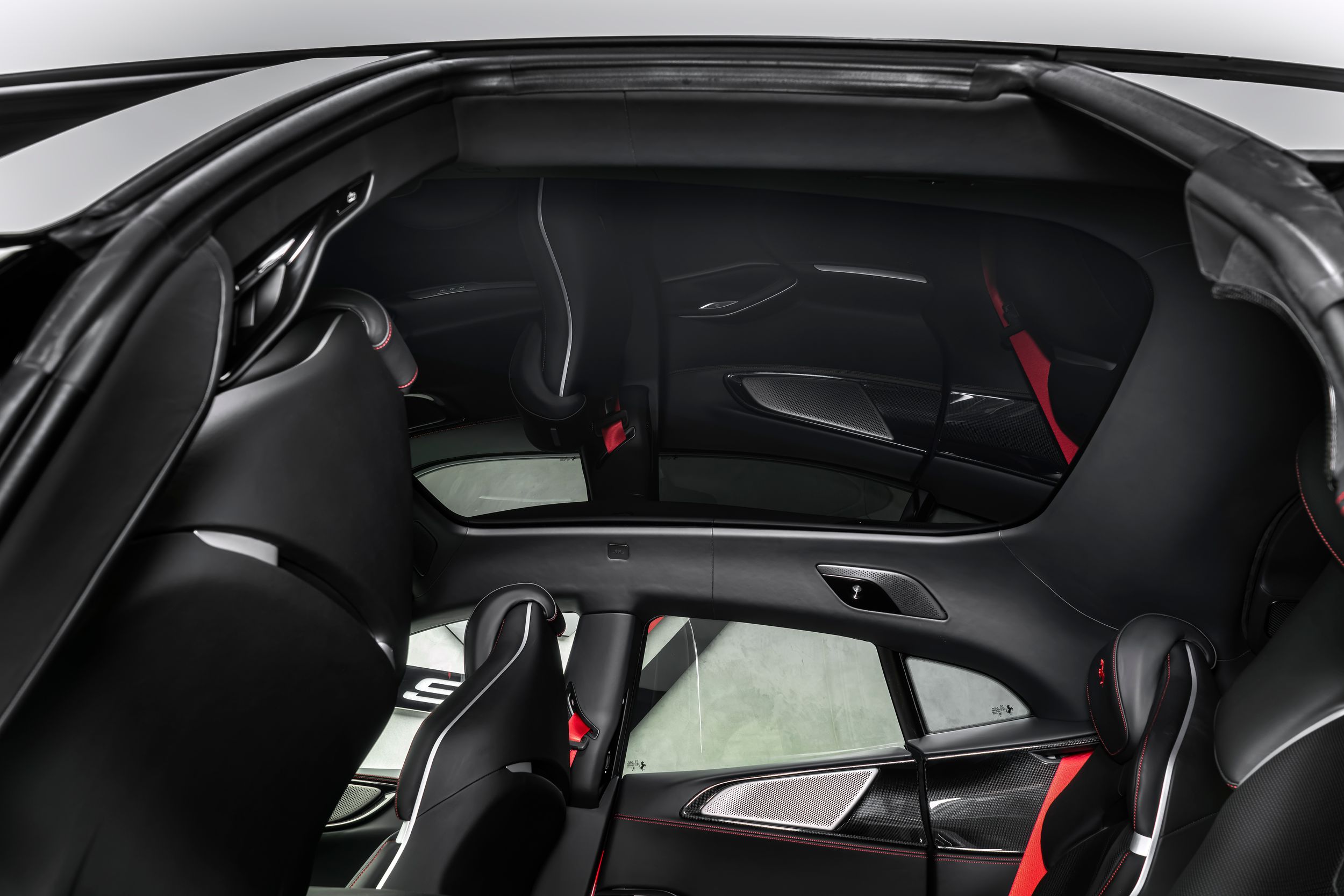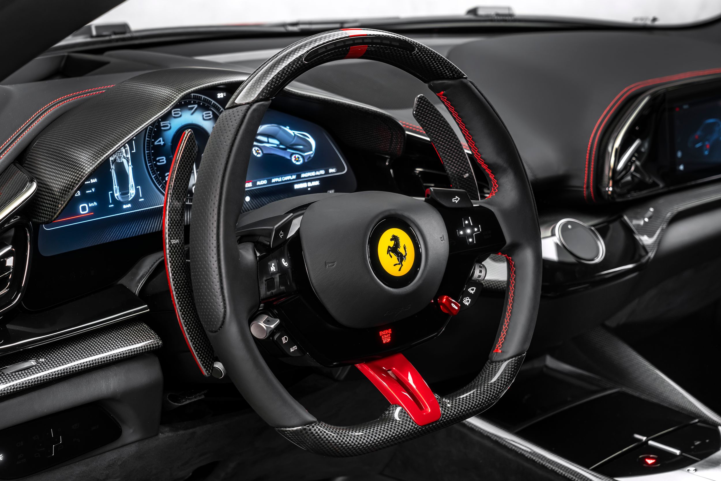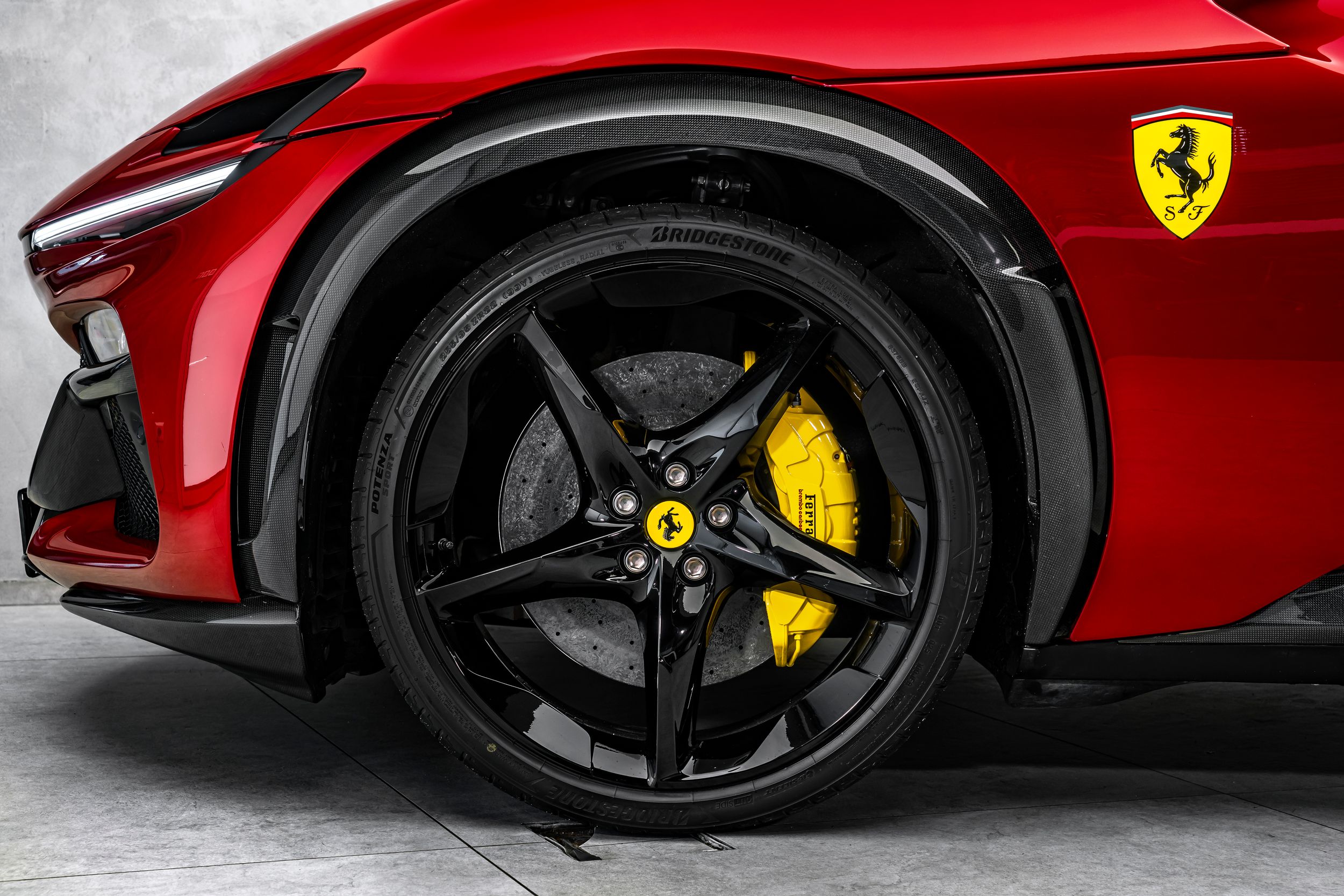 Airbrush shield, air quality sensor, yellow brake callupers, carbon fibre wheelhouse flares, rear diffuser in carbon fibre, carbon fibreouter mirrors, carbon fibre vehicle key, carbon fibre instrument cover, carbon fibre door panels, exteriour sill kickplate in carbon, upper part of centre console in carbon fibre, coloured passenger compartment details, myferrari conncet activated, coloured seat belts, single-colour dreamline on F1 Paddles, panoramic roof, front lift, cavallino stitched on headrest, black tailpipe tips, carbon fibre front spoiler, long narrow it. Flag motif, luggage compartment kit, front seats massag+vent, set of genuine winter wheels, matte black rear cavallino, cavallino+satin ferrari badge, myferrari connect readiness hw, leather upholstery, carb.fib. steering wheel + leds, single colour livery on upper steering wheel rim+lower panel, special 4-layer colours, privacy rear windows, rev counter in yellow, glossy wheels, liquid silver forged wheel, rear seats vent.+ heat, smartphone interface, high-end audio systém, custom specifications, coloured special stitching O.R., heated steering wheel, seats with special design, surround view, cardless svr anti-theft systém, wheel stud bolts in titanium, upper part of passenger compartment in leather, wireless smartphone charger, active matrix led headlights