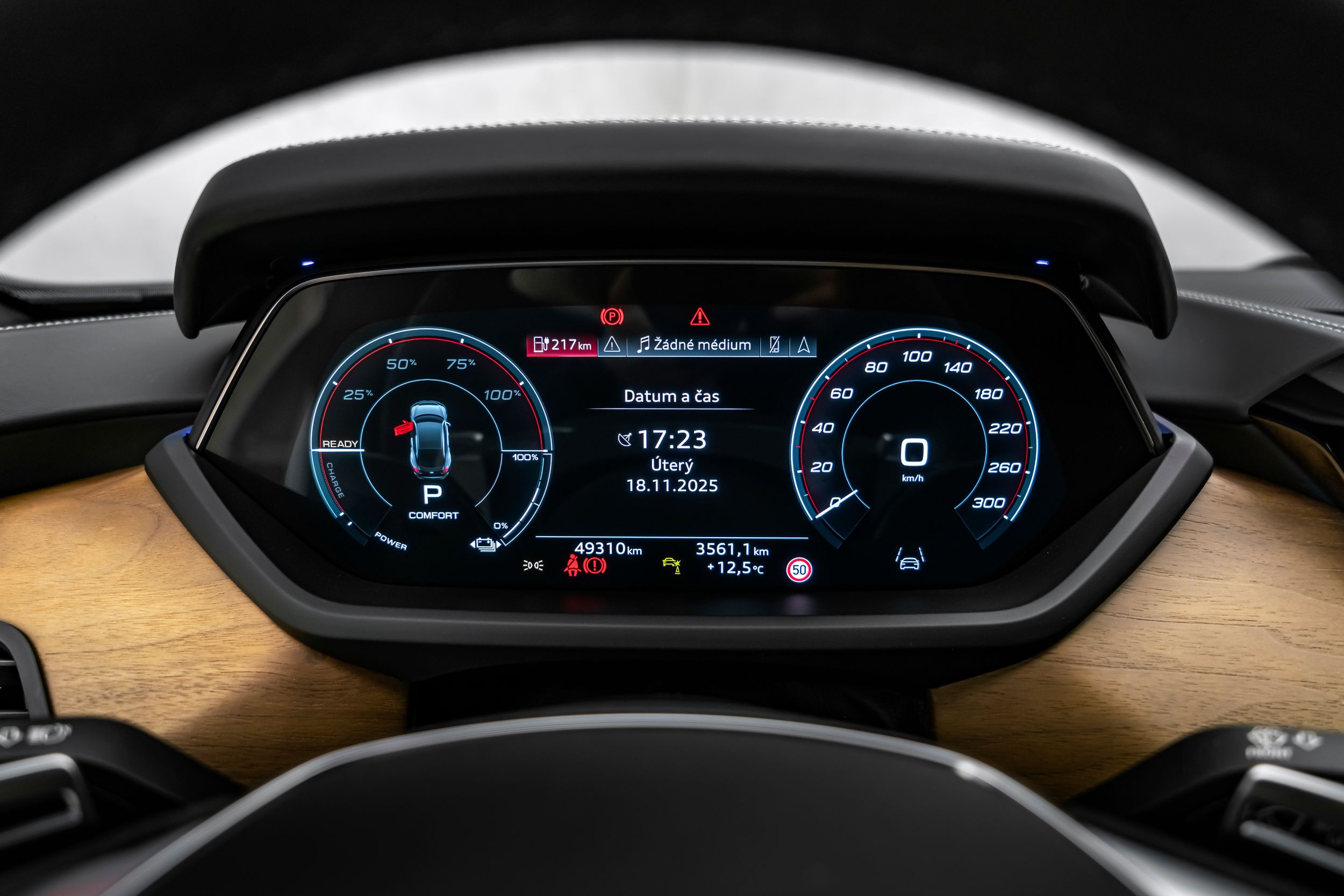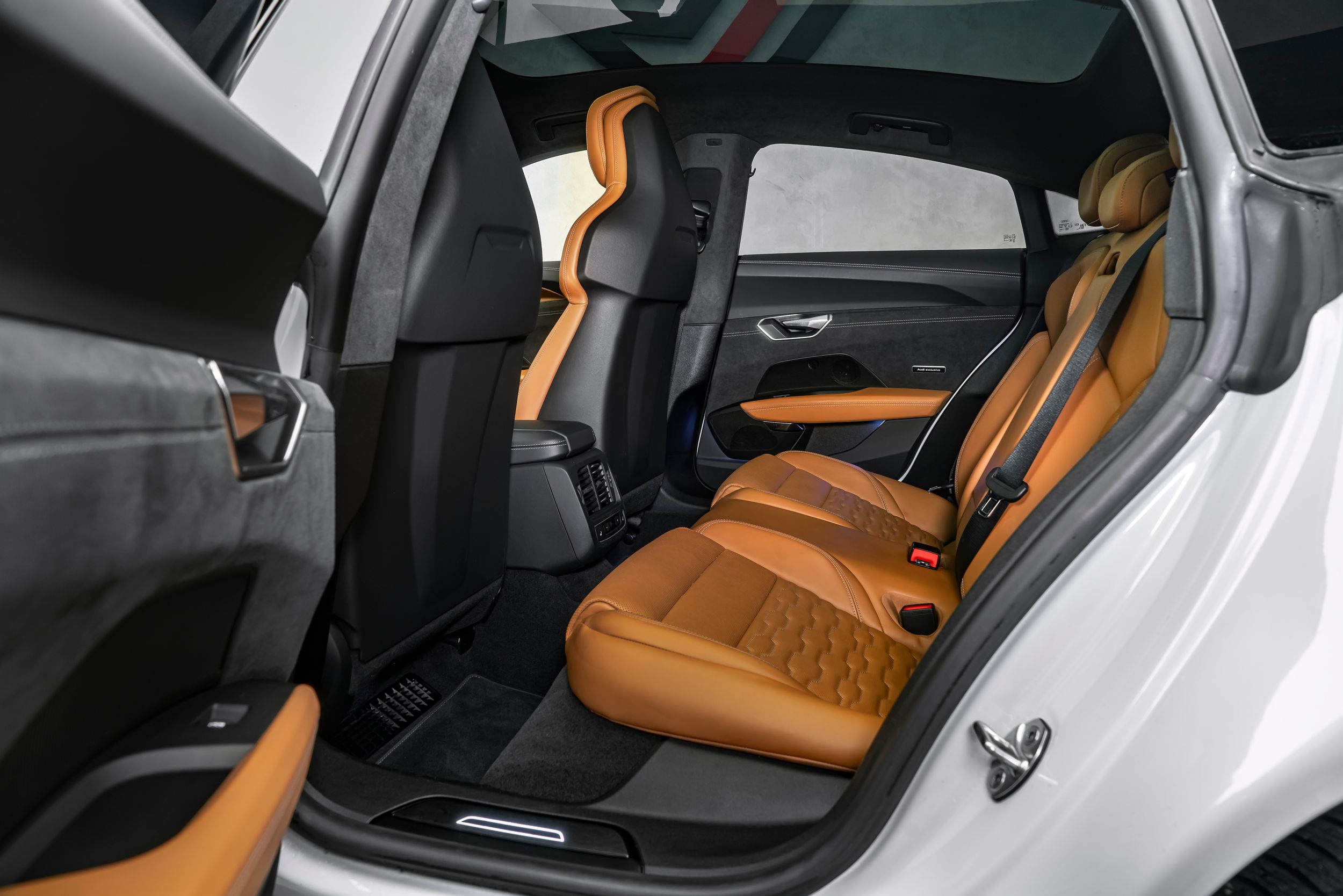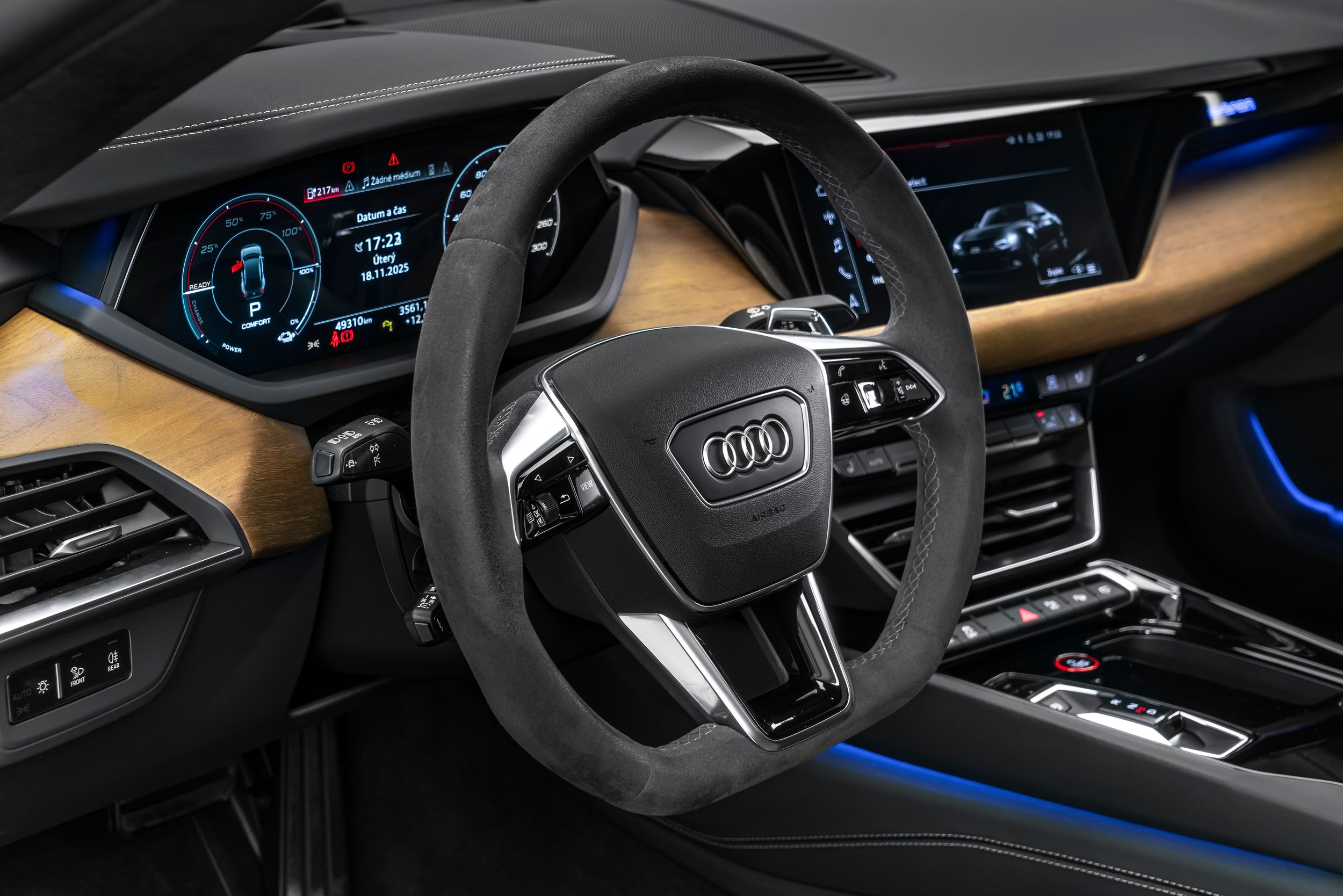 Boční okna z akustických skleněných panelů, ambientní osvětlení (vícebarevné LED), paket asistenčních služeb Plus, černá vnější zpětná zrcátka, handsfree systém Bluetooth s hlasovým rozpoznáváním (Audi Phone Box), čalounění stropu z mikrovlákna Dinamica, paket Design: koňakově hnědá Audi exclusive / šedá Jet, paket Dynamic, nabíjecí systém e-tron connect, osvětlené prahové lišty s hliníkovou intarzií a nápisem, komfortní čelní sklo / akustické sklo, kožené podlahové rohože Audi exclusive s lemováním, head-up displej, obložení interiéru: intarzie z přírodního dřeva z ořechového kořene, obložení interiéru: horní kožené prvky interiéru Audi exclusive, systém pro kontrolu kvality vzduchu s ionizátorem, keramické brzdy vpředu a vzadu, červeně lakované brzdové třmeny, maska ​​chladiče Singleframe v barvě karoserie, nabíjecí kabel s průmyslovou zástrčkou (32 A / 400 V), kola z lehkých slitin vpředu/vzadu: 9,5x21 / 11,5x21 (10paprskový lichoběžníkový modul, černý). (diamantově broušené) Matrix LED světlomety s laserovým světlem, metalický lak, palubní nabíječka (až 22 kW), stylistický paket Black Plus, ventilace a masážní funkce předních sedadel, elektricky nastavitelná přední sedadla (sedadlo řidiče s pamětí), audiosystém Bang & Olufsen, zvukový generátor, sportovní sedadla Pro vpředu, tónovaná zadní okna (zatmavená skla), funkce nabíjení z nástěnného držáku (e-tron).